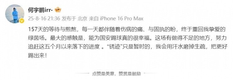 何宇鹏在个人微博中写道:157天的等待与煎熬,每一天都伴随着伤病的痛、与固执的盼,终于重回我挚爱的绿茵场。最大的感触是,能为国安踢球真的很幸福。这场有做得不足的地方,努力追赶这五个月以来落下的进度 。“锈迹”只是暂时的,我会用汗水磨掉生疏,把更好踢出来!